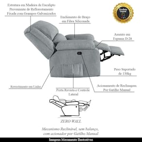 Que tal criar seu próprio home cinema? Aqui, vamos mostrar como você pode montar o seu! Com o local adequado, alguns itens decorativos e uma poltrona ideal, você garantirá um espaço confortável e imersivo. O primeiro passo é investir em equipamentos de alta qualidade! Olha só que lindeza a nossa Poltrona do Papai Reclinável Melim. Ela foi projetada para proporcionar máximo conforto e funcionalidade, esta poltrona é a escolha ideal para quem busca relaxamento, estilo e uma experiência de cinema privada. A fusão de um encosto reclinável com sistema zero wall, que se move para frente durante o reclínio, eliminando a necessidade de espaço adicional para afastamento de paredes, junto com um apoio para os pés ativado manualmente, oferece uma experiência completa de relaxamento, ocupando pouco espaço na área traseira da poltrona. O mecanismo da poltrona em aço é feito manualmente, utilizando um gatilho localizado em uma das Braças na lateral da poltrona. Ao puxar ou pressionar esse gatilho, o usuário pode reclinar o encosto ou levantar o apoio para os pés, ajustando a poltrona à posição desejada. Ela conta com capacidade para suportar até 130 kg, oferecendo segurança e estabilidade ao consumidor. O revestimento em Linho Cinza oferece um toque de sofisticação e conforto, enquanto a estrutura em madeira de eucalipto proveniente de reflorestamento garante resistência e durabilidade. O Braço é preenchido em Fibra Siliconada e o assento foi preenchido espuma D-28, respectivamente, para um conforto adicional. O assento (fixo) e o apoio de Pés Retrátil proporcionam um apoio perfeito para suas pernas, aumentando o conforto. Já os pés fixos foram feitos em aço revestido com plástico, adicionando um toque de elegância ao produto. E tem mais!! Ela contém Bolso lateral para revistas e controle nas braças perfeito para armazenar livros e outros objetos, mantendo tudo ao seu alcance. Com um design moderno e prático, esta poltrona se tornará o destaque da sua sala de estar. Afinal, sua casa merece a Poltrona do Papai Reclinável Melim Zero Wall. Adquira a sua agora mesmo e transforme sua sala de estar em um verdadeiro cinema!