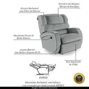 Que tal criar seu próprio home cinema? Aqui, vamos mostrar como você pode montar o seu! Com o local adequado, alguns itens decorativos e uma poltrona ideal, você garantirá um espaço confortável e imersivo. O primeiro passo é investir em equipamentos de alta qualidade! Olha só que lindeza a nossa Poltrona Reclinável do Papai Napoli. Ela foi projetada para proporcionar máximo conforto e funcionalidade, esta poltrona é a escolha ideal para quem busca relaxamento, estilo e uma experiência de cinema privada. Com capacidade para suportar até 110 kg oferecendo segurança e estabilidade ao consumidor. O revestimento em Sintético PU Cinza oferece um toque de sofisticação e conforto, enquanto a estrutura em Madeira Maciça de Eucalipto garante resistência e durabilidade. O sistema de abertura fácil permite ajustar a poltrona sem esforço: basta acionar o mecanismo power com controle de acionamento Bi-volt, onde possibilita que você encontre a posição perfeita com um simples toque de um botão. O encosto e o assento são sustentados por fibra siliconada e espuma D-28, no assento também possui Molas respectivamente para um conforto adicional. O assento (fixo) e o apoio de Pés Retrátil proporcionam um apoio perfeito para suas pernas, aumentando o conforto. O encosto reclinável, possibilita ajustá- lo para a posição ideal de relaxamento. Já os pés (fixos) foram feitos em Aço Revestido com Plástico, adicionando um toque de elegância ao produto. Com um design moderno e prático, esta poltrona se tornará o destaque da sua sala de estar. Afinal, sua casa merece a Poltrona do Papai Reclinável Napoli Controle Power Elétrico. Adquira a sua agora mesmo e transforme sua sala de estar em um verdadeiro cinema!