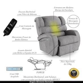 Diferenciais: Poltrona Elétrica com Massagem, Apoio de pés retrátil, botão LED para acionamento