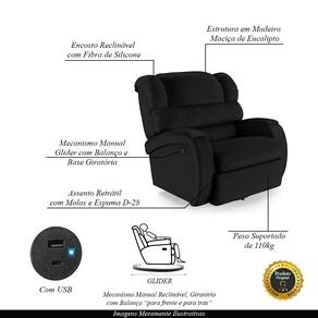 Que tal criar seu próprio home cinema? Aqui, vamos mostrar como você pode montar o seu! Com o local adequado, alguns itens decorativos e uma poltrona ideal, você garantirá um espaço confortável e imersivo. O primeiro passo é investir em equipamentos de alta qualidade! Olha só que lindeza a nossa Poltrona do Papai Reclinável Napoli. Ela foi projetada para proporcionar máximo conforto e funcionalidade, esta poltrona é a escolha ideal para quem busca relaxamento, estilo e uma experiência de cinema privada. A poltrona com sistema glider, encosto reclinável e apoio para os pés manual oferece um relaxamento total, sendo giratória e com balanço suave. Este ajuste é feito manualmente, utilizando um gatilho localizado na lateral da poltrona. Ao puxar ou pressionar esse gatilho, o usuário pode reclinar o encosto ou levantar o apoio para os pés, ajustando a poltrona à posição desejada. Além disso, possui USB trazendo praticidade na hora de carregar seu celular sem sair do seu conforto. Com capacidade para suportar até 110 kg, oferecendo segurança e estabilidade ao consumidor. O revestimento em PU Preto oferece um toque de sofisticação e conforto, enquanto a estrutura em Madeira Maciça de Eucalipto. O encosto foi preenchido com fibra siliconada, no assento contém espuma D-28, respectivamente, para um conforto adicional. O assento (fixo) e o apoio de Pés Retrátil proporcionam um apoio perfeito para suas pernas, aumentando o conforto. O encosto reclinável, possibilita ajustá- lo para a posição ideal de relaxamento. Já os pés giratórios foram feitos em aço revestido com plástico, adicionando um toque de elegância ao produto. Com um design moderno e prático, esta poltrona se tornará o destaque da sua sala de estar. Afinal, sua casa merece a Poltrona do Papai Reclinável Napoli Glider Giratória USB. Adquira a sua agora mesmo e transforme sua sala de estar em um verdadeiro cinema!