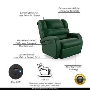 Que tal criar seu próprio home cinema? Aqui, vamos mostrar como você pode montar o seu! Com o local adequado, alguns itens decorativos e uma poltrona ideal, você garantirá um espaço confortável e imersivo. O primeiro passo é investir em equipamentos de alta qualidade! Olha só que lindeza a nossa Poltrona do Papai Reclinável Napoli. Ela foi projetada para proporcionar máximo conforto e funcionalidade, esta poltrona é a escolha ideal para quem busca relaxamento, estilo e uma experiência de cinema privada. A poltrona com sistema glider, encosto reclinável e apoio para os pés manual oferece um relaxamento total, sendo giratória e com balanço suave. Este ajuste é feito manualmente, utilizando um gatilho localizado na lateral da poltrona. Ao puxar ou pressionar esse gatilho, o usuário pode reclinar o encosto ou levantar o apoio para os pés, ajustando a poltrona à posição desejada. Além disso, possui USB trazendo praticidade na hora de carregar seu celular sem sair do seu conforto. Com capacidade para suportar até 110 kg, oferecendo segurança e estabilidade ao consumidor. O revestimento em PU Verde Musgo oferece um toque de sofisticação e conforto, enquanto a estrutura em Madeira Maciça de Eucalipto. O encosto foi preenchido com fibra siliconada, no assento contém espuma D-28, respectivamente, para um conforto adicional. O assento (fixo) e o apoio de Pés Retrátil proporcionam um apoio perfeito para suas pernas, aumentando o conforto. O encosto reclinável, possibilita ajustá- lo para a posição ideal de relaxamento. Já os pés giratórios foram feitos em aço revestido com plástico, adicionando um toque de elegância ao produto. Com um design moderno e prático, esta poltrona se tornará o destaque da sua sala de estar. Afinal, sua casa merece a Poltrona do Papai Reclinável Napoli Glider Giratória USB. Adquira a sua agora mesmo e transforme sua sala de estar em um verdadeiro cinema!