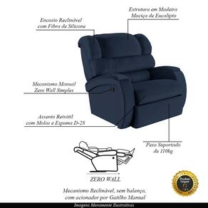 Que tal criar seu próprio home cinema? Aqui, vamos mostrar como você pode montar o seu! Com o local adequado, alguns itens decorativos e uma poltrona ideal, você garantirá um espaço confortável e imersivo. O primeiro passo é investir em equipamentos de alta qualidade! Olha só que lindeza a nossa Poltrona do Papai Reclinável Napoli. Ela foi projetada para proporcionar máximo conforto e funcionalidade, esta poltrona é a escolha ideal para quem busca relaxamento, estilo e uma experiência de cinema privada. A fusão de um encosto reclinável com sistema zero wall, que se move para frente durante o reclínio, eliminando a necessidade de espaço adicional para afastamento de paredes, junto com um apoio para os pés ativado manualmente, oferece uma experiência completa de relaxamento, ocupando pouco espaço na área traseira da poltrona. O mecanismo da poltrona em aço é feito manualmente, utilizando um gatilho localizado na lateral da poltrona. Ao puxar ou pressionar esse gatilho, o usuário pode reclinar o encosto ou levantar o apoio para os pés, ajustando a poltrona à posição desejada. Ela conta com capacidade para suportar até 110 kg, oferecendo segurança e estabilidade ao consumidor. O revestimento em PU Azul oferece um toque de sofisticação e conforto, enquanto a estrutura em madeira de eucalipto proveniente de reflorestamento garante resistência e durabilidade. O encosto foi preenchido com fibra siliconada. O assento foi preenchido com molas e espuma D-28, respectivamente, para um conforto adicional. O assento e o apoio de Pés Retrátil proporcionam um apoio perfeito para suas pernas, aumentando o conforto. Já os pés fixos foram feitos em aço revestido com plástico, adicionando um toque de elegância ao produto. Com um design moderno e prático, esta poltrona se tornará o destaque da sua sala de estar. Afinal, sua casa merece a Poltrona do Papai Reclinável Napoli Manual Gatilho. Adquira a sua agora mesmo e transforme sua sala de estar em um verdadeiro cinema!
