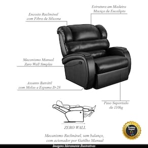 Que tal criar seu próprio home cinema? Aqui, vamos mostrar como você pode montar o seu! Com o local adequado, alguns itens decorativos e uma poltrona ideal, você garantirá um espaço confortável e imersivo. O primeiro passo é investir em equipamentos de alta qualidade! Olha só que lindeza a nossa Poltrona do Papai Reclinável Napoli. Ela foi projetada para proporcionar máximo conforto e funcionalidade, esta poltrona é a escolha ideal para quem busca relaxamento, estilo e uma experiência de cinema privada. A fusão de um encosto reclinável com sistema zero wall, que se move para frente durante o reclínio, eliminando a necessidade de espaço adicional para afastamento de paredes, junto com um apoio para os pés ativado manualmente, oferece uma experiência completa de relaxamento, ocupando pouco espaço na área traseira da poltrona. O mecanismo da poltrona em aço é feito manualmente, utilizando um gatilho localizado na lateral da poltrona. Ao puxar ou pressionar esse gatilho, o usuário pode reclinar o encosto ou levantar o apoio para os pés, ajustando a poltrona à posição desejada. Ela conta com capacidade para suportar até 110 kg, oferecendo segurança e estabilidade ao consumidor. O revestimento em PU Preto Brilho oferece um toque de sofisticação e conforto, enquanto a estrutura em madeira de eucalipto proveniente de reflorestamento garante resistência e durabilidade. O encosto foi preenchido com fibra siliconada. O assento foi preenchido com molas e espuma D-28, respectivamente, para um conforto adicional. O assento e o apoio de Pés Retrátil proporcionam um apoio perfeito para suas pernas, aumentando o conforto. Já os pés fixos foram feitos em aço revestido com plástico, adicionando um toque de elegância ao produto. Com um design moderno e prático, esta poltrona se tornará o destaque da sua sala de estar. Afinal, sua casa merece a Poltrona do Papai Reclinável Napoli Manual Gatilho. Adquira a sua agora mesmo e transforme sua sala de estar em um verdadeiro cinema!