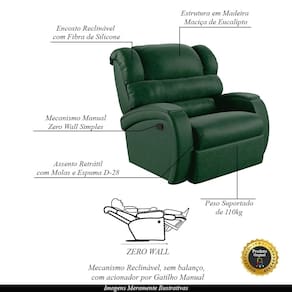 Que tal criar seu próprio home cinema? Aqui, vamos mostrar como você pode montar o seu! Com o local adequado, alguns itens decorativos e uma poltrona ideal, você garantirá um espaço confortável e imersivo. O primeiro passo é investir em equipamentos de alta qualidade! Olha só que lindeza a nossa Poltrona do Papai Reclinável Napoli. Ela foi projetada para proporcionar máximo conforto e funcionalidade, esta poltrona é a escolha ideal para quem busca relaxamento, estilo e uma experiência de cinema privada. A fusão de um encosto reclinável com sistema zero wall, que se move para frente durante o reclínio, eliminando a necessidade de espaço adicional para afastamento de paredes, junto com um apoio para os pés ativado manualmente, oferece uma experiência completa de relaxamento, ocupando pouco espaço na área traseira da poltrona. O mecanismo da poltrona em aço é feito manualmente, utilizando um gatilho localizado na lateral da poltrona. Ao puxar ou pressionar esse gatilho, o usuário pode reclinar o encosto ou levantar o apoio para os pés, ajustando a poltrona à posição desejada. Ela conta com capacidade para suportar até 110 kg, oferecendo segurança e estabilidade ao consumidor. O revestimento em PU Verde Musgo oferece um toque de sofisticação e conforto, enquanto a estrutura em madeira de eucalipto proveniente de reflorestamento garante resistência e durabilidade. O encosto foi preenchido com fibra siliconada. O assento foi preenchido com molas e espuma D-28, respectivamente, para um conforto adicional. O assento e o apoio de Pés Retrátil proporcionam um apoio perfeito para suas pernas, aumentando o conforto. Já os pés fixos foram feitos em aço revestido com plástico, adicionando um toque de elegância ao produto. Com um design moderno e prático, esta poltrona se tornará o destaque da sua sala de estar. Afinal, sua casa merece a Poltrona do Papai Reclinável Napoli Manual Gatilho. Adquira a sua agora mesmo e transforme sua sala de estar em um verdadeiro cinema!