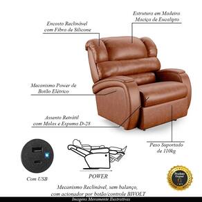 Que tal criar seu próprio home cinema? Aqui, vamos mostrar como você pode montar o seu! Com o local adequado, alguns itens decorativos e uma poltrona ideal, você garantirá um espaço confortável e imersivo. O primeiro passo é investir em equipamentos de alta qualidade! Olha só que lindeza a nossa Poltrona do Papai Reclinável Napoli. Ela foi projetada para proporcionar máximo conforto e funcionalidade, esta poltrona é a escolha ideal para quem busca relaxamento, estilo e uma experiência de cinema privada. A facilidade de ajuste com o botão elétrico com LED permite que você encontre a posição perfeita com o toque suave de um botão touch, pensado para proporcionar uma experiência imersiva sem igual. Além disso, possui USB trazendo praticidade na hora de carregar seu celular sem sair do seu conforto. Ela conta com capacidade para suportar até 110 kg, oferecendo segurança e estabilidade ao consumidor. O revestimento em PU Caramelo Brilho oferece um toque de sofisticação e conforto, enquanto a estrutura em Composta por Madeira Maciça de Eucalipto garante resistência e durabilidade. O encosto foi preenchido com fibra siliconada. O assento foi preenchido com molas e espuma D-28, respectivamente, para um conforto adicional. O assento e o apoio de Pés Retrátil proporcionam um apoio perfeito para suas pernas, aumentando o conforto. Já os pés fixos foram feitos em aço revestido com plástico, adicionando um toque de elegância ao produto. Com um design moderno e prático, esta poltrona se tornará o destaque da sua sala de estar. Afinal, sua casa merece a Poltrona do Papai Reclinável Napoli Power Touch USB. Adquira a sua agora mesmo e transforme sua sala de estar em um verdadeiro cinema!
