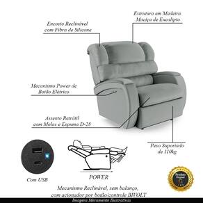 Que tal criar seu próprio home cinema? Aqui, vamos mostrar como você pode montar o seu! Com o local adequado, alguns itens decorativos e uma poltrona ideal, você garantirá um espaço confortável e imersivo. O primeiro passo é investir em equipamentos de alta qualidade! Olha só que lindeza a nossa Poltrona do Papai Reclinável Napoli. Ela foi projetada para proporcionar máximo conforto e funcionalidade, esta poltrona é a escolha ideal para quem busca relaxamento, estilo e uma experiência de cinema privada. A facilidade de ajuste com o botão elétrico com LED permite que você encontre a posição perfeita com o toque suave de um botão touch, pensado para proporcionar uma experiência imersiva sem igual. Além disso, possui USB trazendo praticidade na hora de carregar seu celular sem sair do seu conforto. Ela conta com capacidade para suportar até 110 kg, oferecendo segurança e estabilidade ao consumidor. O revestimento em PU Cinza oferece um toque de sofisticação e conforto, enquanto a estrutura em Composta por Madeira Maciça de Eucalipto garante resistência e durabilidade. O encosto foi preenchido com fibra siliconada. O assento foi preenchido com molas e espuma D-28, respectivamente, para um conforto adicional. O assento e o apoio de Pés Retrátil proporcionam um apoio perfeito para suas pernas, aumentando o conforto. Já os pés fixos foram feitos em aço revestido com plástico, adicionando um toque de elegância ao produto. Com um design moderno e prático, esta poltrona se tornará o destaque da sua sala de estar. Afinal, sua casa merece a Poltrona do Papai Reclinável Napoli Power Touch USB. Adquira a sua agora mesmo e transforme sua sala de estar em um verdadeiro cinema!