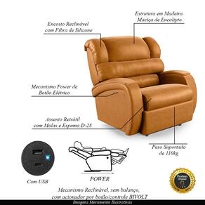 Que tal criar seu próprio home cinema? Aqui, vamos mostrar como você pode montar o seu! Com o local adequado, alguns itens decorativos e uma poltrona ideal, você garantirá um espaço confortável e imersivo. O primeiro passo é investir em equipamentos de alta qualidade! Olha só que lindeza a nossa Poltrona do Papai Reclinável Napoli. Ela foi projetada para proporcionar máximo conforto e funcionalidade, esta poltrona é a escolha ideal para quem busca relaxamento, estilo e uma experiência de cinema privada. A facilidade de ajuste com o botão elétrico com LED permite que você encontre a posição perfeita com o toque suave de um botão touch, pensado para proporcionar uma experiência imersiva sem igual. Além disso, possui USB trazendo praticidade na hora de carregar seu celular sem sair do seu conforto. Ela conta com capacidade para suportar até 110 kg, oferecendo segurança e estabilidade ao consumidor. O revestimento em PU Whisky oferece um toque de sofisticação e conforto, enquanto a estrutura em Composta por Madeira Maciça de Eucalipto garante resistência e durabilidade. O encosto foi preenchido com fibra siliconada. O assento foi preenchido com molas e espuma D-28, respectivamente, para um conforto adicional. O assento e o apoio de Pés Retrátil proporcionam um apoio perfeito para suas pernas, aumentando o conforto. Já os pés fixos foram feitos em aço revestido com plástico, adicionando um toque de elegância ao produto. Com um design moderno e prático, esta poltrona se tornará o destaque da sua sala de estar. Afinal, sua casa merece a Poltrona do Papai Reclinável Napoli Power Touch USB. Adquira a sua agora mesmo e transforme sua sala de estar em um verdadeiro cinema!