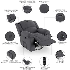 Com seu design moderno e elegante, ela não só complementa a decoração de sua casa, mas também oferece um conforto inigualável. Seja mergulhando nas páginas de um bom livro ou se deliciando com seus filmes e séries prediletos, essa Poltrona Massageadora será o seu refúgio particular. A combinação do sistema glider ao encosto e apoio para os pés ativados com mecanismo manual proporcionam uma experiência de relaxamento total, pois ela é giratória com balanço, e acompanha controle para acionar a massagem. Ah! E ela ainda conta com entrada USB e tipo C ideal para carregar seus eletrônicos enquanto descansa. Fabricada com materiais de alta qualidade, como a madeira de eucalipto e espuma D-28, ela garante durabilidade e suporte. Além disso o revestimento de alta qualidade é um detalhe que enriquece ainda mais a sua experiência. Não deixe escapar a chance de elevar sua sala de estar a um patamar de conforto e estilo com a Poltrona Do Papai.