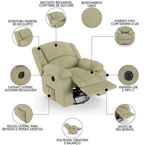 Com seu design moderno e elegante, ela não só complementa a decoração de sua casa, mas também oferece um conforto inigualável. Seja mergulhando nas páginas de um bom livro ou se deliciando com seus filmes e séries prediletos, essa Poltrona Reclinável será o seu refúgio particular. A combinação do sistema glider ao encosto e apoio para os pés ativados com mecanismo manual proporcionam uma experiência de relaxamento total, pois ela é giratória e possui balanço. Ah! E ela ainda conta com entrada USB e tipo C ideal para carregar seus eletrônicos enquanto descansa. Fabricada com materiais de alta qualidade, como a madeira de eucalipto e espuma D-28, ela garante durabilidade e suporte. Além disso o revestimento de alta qualidade é um detalhe que enriquece ainda mais a sua experiência. Não deixe escapar a chance de elevar sua sala de estar a um patamar de conforto e estilo com a Poltrona Do Papai.