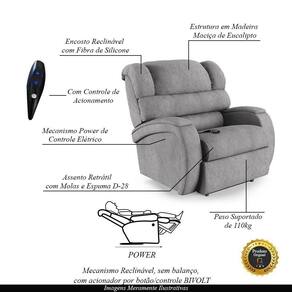 Dimensões do Produto:Largura: 93cmAltura: 95cmProfundidade: 96cmProfundidade Aberto: 169cmAltura do Encosto: 62cmAltura do Assento até o Chão: 46cm Características do Produto:Estrutura: Composta por Madeira Maciça de Eucalipto;Assento: com Molas e Espuma D-28;Encosto: Reclinável com Enchimento em Fibra de Silicone;Mecanismo: Controle Elétrico Bi Volt;Tipo de Base: Fixa;Material dos Pés: Aço Revestido com Plástico;Revestimento: Linho;Peso Suportado: 110kg;Conteúdo da Embalagem: 1 Poltrona;Necessita de Montagem: Não;Instruções/Cuidado: Recomendado somente limpeza com pano umedecido;
