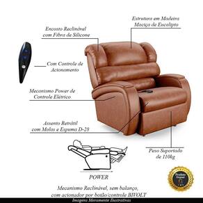Dimensões do Produto:Largura: 93cmAltura: 95cmProfundidade: 96cmProfundidade Aberto: 169cmAltura do Encosto: 62cmAltura do Assento até o Chão: 46cm Características do Produto:Estrutura: Composta por Madeira Maciça de Eucalipto;Assento: com Molas e Espuma D-28;Encosto: Reclinável com Enchimento em Fibra de Silicone;Mecanismo: Controle Elétrico Bi Volt;Tipo de Base: Fixa;Material dos Pés: Aço Revestido com Plástico;Revestimento: PU;Peso Suportado: 110kg;Conteúdo da Embalagem: 1 Poltrona;Necessita de Montagem: Não;Instruções/Cuidado: Recomendado somente limpeza com pano umedecido;