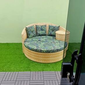Revestimento trançado fibra sintética com tratamento Uv, resistente a sol e chuva, podendo ser lavado normalmente sem risco de danos