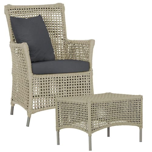 A corda nautica adiciona um toque de rusticidade moderna, enquanto o estofado impermeavel garante que sua poltrona esteja sempre impecavel, mesmo apos uma chuva inesperada ou um acidente com liquidos.