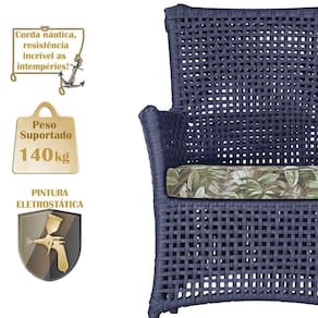 A corda nautica adiciona um toque de rusticidade moderna, enquanto o estofado impermeavel garante que sua poltrona esteja sempre impecavel, mesmo apos uma chuva inesperada ou um acidente com liquidos.