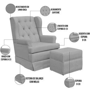 Descrição do produto: A hora da amamentação é um momento de incrível conexão da mãe com o bebê. Nesta nova e desafiante fase, a poltrona de amamentação ideal faz total diferença para que flua lmente e atenda todas as necessidades, deixando a mãe e o bebê extremamente confortáveis. Possui mecanismo de balanço, é o movimento da poltrona é uma opção funcional para ajudar a acalmar o bebê. Para a mãe, previne possíveis dores ou desconforto na hora de amamentar, além da altura ser ideal para que levante da poltrona sem dificuldades, e também sem acordar o seu pequeno. O puff é um componente aliado para o conforto dos pés, detalhe que faz total diferença.