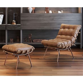 Características: Marca: Mais Decor Modelo: M06 Tecido Predominante: Couro Material da Estrutura: Ferro Tipo de Poltrona: Decorativa Acompanha Puff: Sim Tipo de Encosto: Fixo Almofada do Encosto: Fixa Enchimento do Encosto: Espuma D-18 Altura do Encosto: 50 cm Tipo de Espuma do Encosto: Fibra Siliconada Tipo de Assento: Fixo Altura do Assento até o Chão: 50 cm Enchimento do Assento: Fibra Siliconada Firmeza do Assento: Macio Tipo de Espuma do Assento: Fibra Siliconada Possui Apoio para Braços: Não Possui Pés: 08 Material dos Pés: Ferro Altura dos Pés: 30 cm Necessita Montagem: Não Recomendações de Uso, Manutenção e Limpeza: Uma boa maneira de aumentar o tempo de vida útil do seu sofá é evitar exposição direta do estofado ao sol, já que os raios podem queimar e manchar a grande maioria dos tecidos desses itens da sua casa. Suporta Até -kg-: 120 Possui Percintas Elásticas: Não