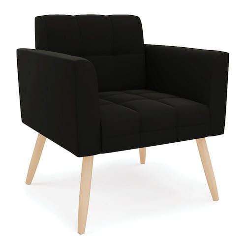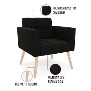 Você gosta de colecionar vários momentos memoráveis com sua família e amigos? Que tal recebê-los, com móveis de altíssima qualidade que só a DRossi tem? A Poltrona Elisa é adequada para você! Seu design retrô é a grande tendência do momento. Pode ser usada em diversos espaços da casa, em salas, hall de entrada, quartos, cozinhas, varanda, sacada, escritório, dentre outros. Contém as seguintes características: A estrutura é feita de madeira de Eucalipto 100% de reflorestamento, e os Pés Palito Natural, além de serem resistentes e duráveis, suportam em média até 120 kg. Assento, encosto e braços, contém enchimento de espuma D-23 e é estofada em tecido Suede, no tom Preto, que oferece muito conforto e resistência ao sentar, com aquela sensação de maciez e aconchego. Possui também, detalhes de costura no encosto e assento, resultando em um acabamento impecável, conferindo muito mais valor e elegância ao seu espaço. Para complementar a decoração com essa linda poltrona, a dica é utilizar mantas, almofadas ou vasinho de flor. E pronto, seu cantinho estará perfeito para descansar e relaxar! Aqui, você encontra várias opções, para que seus amigos e familiares se sintam acolhidos. Garanta já sua Poltrona.