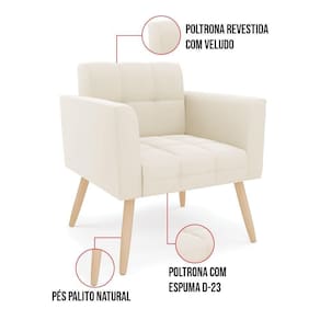 Você gosta de colecionar vários momentos memoráveis com sua família e amigos? Que tal recebê-los, com móveis de altíssima qualidade que só a DRossi tem? A Poltrona Elisa é adequada para você! Seu design retrô é a grande tendência do momento. Pode ser usada em diversos espaços da casa, em salas, hall de entrada, quartos, cozinhas, varanda, sacada, escritório, dentre outros. Contém as seguintes características: A estrutura é feita de madeira de Eucalipto 100% de reflorestamento, e os Pés Palito Natural, além de serem resistentes e duráveis, suportam em média até 120 kg. Assento, encosto e braços, contém enchimento de espuma D-23 e é estofada em tecido Veludo, no tom Bege, que oferece muito conforto e resistência ao sentar, com aquela sensação de maciez e aconchego. Possui também, detalhes de costura no encosto e assento, resultando em um acabamento impecável, conferindo muito mais valor e elegância ao seu espaço. Para complementar a decoração com essa linda poltrona, a dica é utilizar mantas, almofadas ou vasinho de flor. E pronto, seu cantinho estará perfeito para descansar e relaxar! Aqui, você encontra várias opções, para que seus amigos e familiares se sintam acolhidos. Garanta já sua Poltrona.