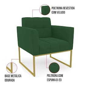 Você gosta de colecionar vários momentos memoráveis com sua família e amigos? Que tal recebê-los, com móveis de altíssima qualidade que só a DRossi tem? A Poltrona Elisa é adequada para você! Seu design retrô é a grande tendência do momento. Pode ser usada em diversos espaços da casa, em salas, hall de entrada, quartos, cozinhas, varanda, sacada, escritório, dentre outros. Contém as seguintes características: A estrutura é feita de madeira de Eucalipto 100% de reflorestamento, e a Base Metálica Industrial Dourado, além de ser resistente e durável, suporta em média até 120 kg. Assento, encosto e braços, contém enchimento de espuma D-23 e é estofada em tecido Veludo, no tom Verde, que oferece muito conforto e resistência ao sentar, com aquela sensação de maciez e aconchego. Possui também, detalhes de costura no encosto e assento, resultando em um acabamento impecável, conferindo muito mais valor e elegância ao seu espaço. Para complementar a decoração com essa linda poltrona, a dica é utilizar mantas, almofadas ou vasinho de flor. E pronto, seu cantinho estará perfeito para descansar e relaxar! Aqui, você encontra várias opções, para que seus amigos e familiares se sintam acolhidos. Garanta já sua Poltrona.