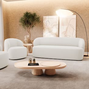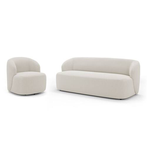 Estrutura: Madeira de Eucalipto e MDF. Estofamento: Espuma D-20 e D-26. Revestimento: Bouclê. Pés do Sofá: Madeira. Pés da Poltrona: Aço.Vendido e entregue por Desk Design