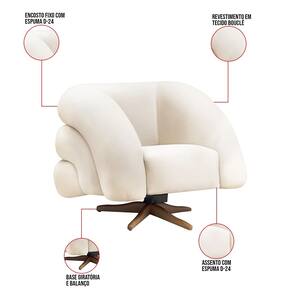 A poltrona Tana é uma peça elegante e funcional, projetada para proporcionar conforto e estilo. Ela possui uma base de ferro giratória, o que permite que você gire a cadeira com facilidade, além de ter um balanço suave, proporcionando uma experiência de relaxamento agradável. A aplicação de espuma em camadas nas costas oferece suporte anatômico e conforto extra, ajudando a aliviar a pressão nas costas durante longos períodos de uso. Contém também um lindo revestimento em tecido Bouclê Bege, que cria uma conexão entre a peça e o ambiente. Pode ser utilizada em sala de estar, recepções, escritórios, lojas e espaços comerciais, ou qualquer outro espaço que você queira decorar com estilo e bom gosto. Ela tem uma estrutura em madeira de reflorestamento eucalipto, que garante a resistência e a sustentabilidade do produto. Ela suporta até 120 kg de peso, podendo ser utilizada por pessoas de diferentes biotipos. Ela tem um acabamento reforçado e espuma de qualidade D24, que oferece maciez e aconchego. Ela é fácil de transportar, pois tem um peso leve e um tamanho compacto. A Poltrona Tana é um produto que vai fazer a diferença na sua decoração e no seu bem-estar. Garanta já a sua!