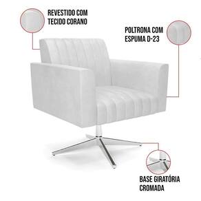 Quer uma decoração única e sofisticada? A Poltrona Viena é ideal para quem está em busca de um móvel versátil e diferenciado. Esse tipo de peça é ideal para ambientes modernos e descontraídos. Vem com uma ideia totalmente diferente, devido sua curva e forma suave, os detalhes gomados do tecido são tendências de decoração atuais. Uma dica legal de complemento é escolher almofadas que combinem com a poltrona. Sua estrutura é confeccionada em madeira de eucalipto proveniente de reflorestamento, o estofamento do assento é composto de espuma prorelax D-23 no encosto, e é revestido em Corano um tecido aconchegante, resistente e extremamente luxuoso. Sua sustentação é dada pela Base Giratória Cromada, suportando em média até 120 Kg. Crie um lindo efeito visual, em qualquer lugar da sua casa ou escritório! Garanta já sua Poltrona Viena.