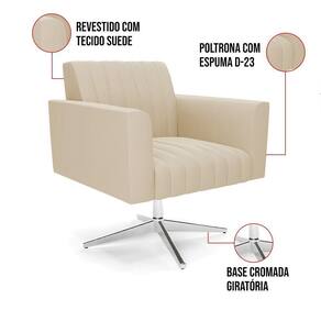 Poltrona Giratória Viena Gomada Suede Base Cromada - D'rossi Cor Bege Quer uma decoração única e sofisticada? A Poltrona Viena é ideal para quem está em busca de um móvel versátil e diferenciado. Esse tipo de peça é ideal para ambientes modernos e descontraídos. Vem com uma ideia totalmente diferente, devido sua curva e forma suave, os detalhes gomados do tecido são tendências de decoração atuais. Uma dica legal de complemento é escolher almofadas que combinem com a poltrona. Sua estrutura é confeccionada em madeira de eucalipto proveniente de reflorestamento, o estofamento do assento é composto de espuma prorelax D-23 no encosto, e é revestido em Suede um tecido aconchegante, resistente e extremamente luxuoso. Sua sustentação é dada pela Base Giratória Cromada, suportando em média até 120 Kg. Crie um lindo efeito visual, em qualquer lugar da sua casa ou escritório! Garanta já sua Poltrona Viena. Dimensões da Poltrona: