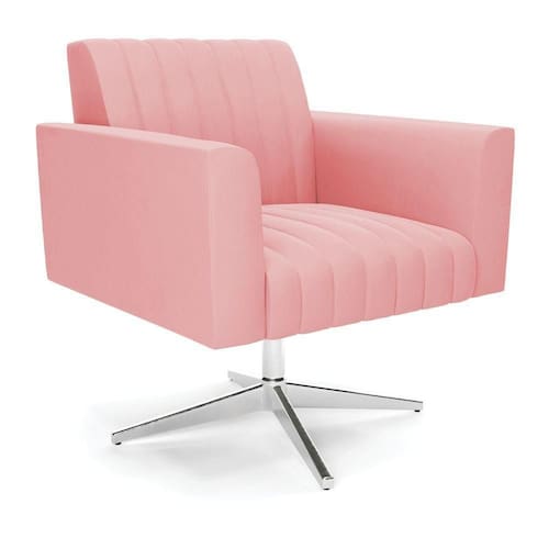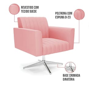 Poltrona Giratória Viena Gomada Suede Rosê Base Cromada - D'rossi Quer uma decoração única e sofisticada? A Poltrona Viena é ideal para quem está em busca de um móvel versátil e diferenciado. Esse tipo de peça é ideal para ambientes modernos e descontraídos. Vem com uma ideia totalmente diferente, devido sua curva e forma suave, os detalhes gomados do tecido são tendências de decoração atuais. O tom Rosê vem ganhando cada vez mais espaço no mercado, uma cor que traz elegância e combina com vários tipos de decoração. Uma dica legal de complemento é escolher almofadas que combinem com a poltrona. Sua estrutura é confeccionada em madeira de eucalipto proveniente de reflorestamento, o estofamento do assento é composto de espuma prorelax D-23 no encosto, e é revestido em Suede um tecido aconchegante, resistente e extremamente luxuoso. Sua sustentação é dada pela Base Giratória Cromada, suportando em média até 120 Kg. Crie um lindo efeito visual, em qualquer lugar da sua casa ou escritório! Garanta já sua Poltrona Viena. Dimensões da Poltrona:
