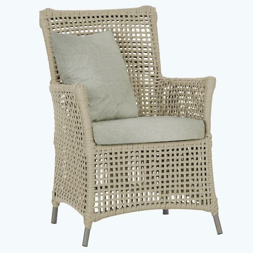 A corda nautica adiciona um toque de rusticidade moderna, enquanto o estofado impermeavel garante que sua poltrona esteja sempre impecavel, mesmo apos uma chuva inesperada ou um acidente com liquidos.