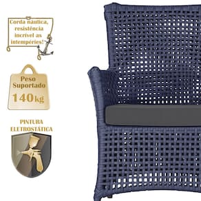 A corda náutica adiciona um toque de rusticidade moderna, enquanto o estofado impermeável garante que sua poltrona esteja sempre impecável, mesmo após uma chuva inesperada ou um acidente com líquidos.