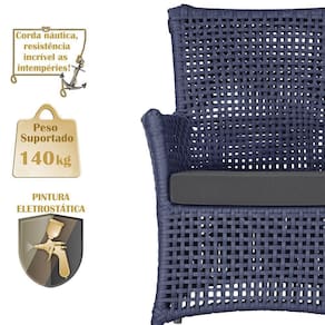 A corda nautica adiciona um toque de rusticidade moderna, enquanto o estofado impermeavel garante que sua poltrona esteja sempre impecavel, mesmo apos uma chuva inesperada ou um acidente com liquidos.