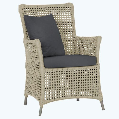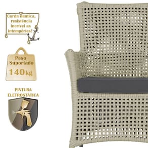 A corda nautica adiciona um toque de rusticidade moderna, enquanto o estofado impermeavel garante que sua poltrona esteja sempre impecavel, mesmo apos uma chuva inesperada ou um acidente com liquidos.