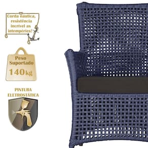 A corda nautica adiciona um toque de rusticidade moderna, enquanto o estofado impermeavel garante que sua poltrona esteja sempre impecavel, mesmo apos uma chuva inesperada ou um acidente com liquidos.