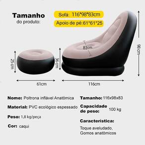 Com dimensões de 80 cm de altura, 140 cm de comprimento e 86 cm de largura, esta poltrona inflável é compacta e fácil de transportar, tornando-a perfeita para camping ou para levar para a praia. Além disso, o conjunto inclui um pufe, proporcionando ainda mais conforto.