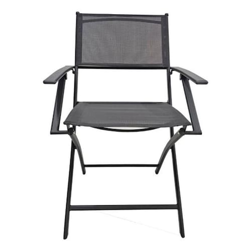 Resumo das caracteristicas e especificacoes: Poltrona de jardim, uso indicado para refeicao, estrutura de aco pintado, encosto e assento de tecido Textilene, cor cinza escuro, com braco, dobravel, nao reclinavel, nao empilhavel, capacidade de peso de 100 kg, dimensoes de 51x54x85 cm, estilo atemporal, peso do produto de 4 kg, indicada para areas externas, entregue montada, nao possui selo FSC r . Atencao: Produto nao indicado para regioes com maresia e/ou contato direto com agua.