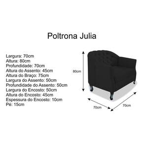 Gostaria de um móvel que trouxesse mais elegância e sofisticação para o seu lar? A Poltrona Julia A02 é sua melhor opção! Com característica moderna e com acabamento de qualidade, este produto atenderá suas expectativas! Não perca essa oportunidade e adquira já a sua!Especificações Técnicas da Poltrona Julia A02: - Altura: 80 cm;- Largura Total: 69 cm;- Profundidade: 70 cm;- Peso: 20 Kg;- Peso Suportado: 120 Kg;Diferenciais da Poltrona Julia A02: - Material da Estrutura: fabricado com Madeira Pinus e Eucalipto Reflorestada, e alguns detalhes em MDF;- Tipo de Assento: Estofado e com espuma de densidade D-26;- Tipo de Encosto: Estofado e com espuma de densidade D-18;- Detalhes do Pé: acompanham pés de madeira de alta resistência;Recomendações de limpeza: -Limpar com flanela limpa e seca. Não molhar o móvel e não expor em lugar úmido ou próximo de fontes de calor. Não usar produtos abrasivos.Observações Importantes: - As imagens ambientadas são meramente ilustrativas e podem apresentar itens que não compõe o produto;- Objetos decorativos que aparecem na foto não acompanham o produto;- As cores do produto podem variar de acordo com o monitor, a iluminação do ambiente, ou sua percepção visual;- A Poltrona Julia A02 chegará montado para você, bastando encaixar os pés;- Confira as dimensões antes da compra e certifique-se de que o produto passará por elevadores, portas e corredores;- Ao receber seus produtos, verifique no ato do recebimento qualquer dano na embalagem;- Produto para uso residencial em ambiente interno, não devendo ficar exposto diretamente ao sol, calor e umidades excessivas.