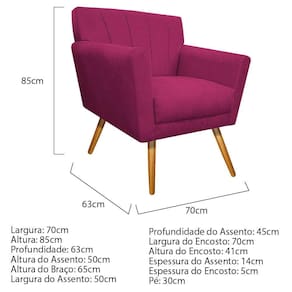Gostaria de um móvel que trouxesse mais elegância e sofisticação para o seu lar? A Poltrona Laura é sua melhor opção! Com característica moderna e com acabamento de qualidade, este produto atenderá suas expectativas! Não perca essa oportunidade e adquira já a sua! Especificações Técnicas da Poltrona Decorativa Laura: - Altura: 85 cm; - Largura: 70 cm; - Profundidade: 63 cm; - Altura do Assento: 50 cm; - Largura do Assento: 50 cm; - Altura do Braço: 65 cm; - Profundidade do Assento: 45 cm; - Largura do Encosto: 70 cm; - Espessura do Assento: 14 cm; - Altura do Encosto: 41 cm; - Espessura do Encosto: 5 cm; - Altura dos Pés: 30 cm; - Peso: 20 kg. - Peso Suportado: 120 kg. Diferenciais da Poltrona Decorativa Laura: - Material da Estrutura: fabricado com Madeira Pinus e Eucalipto , e alguns detalhes em MDF; - Tipo de Assento: estofado e com espuma de densidade D-26; - Tipo de Encosto: estofado e com espuma de densidade D-18; - Detalhes dos Pés: acompanha kit de pés (4 pés) de madeira, no estilo palito na cor mel, com alta resistência; - Volumes: nessa compra você receberá um único produto. Recomendações de limpeza: -Limpar com flanela limpa e seca. Não molhar o móvel e não expor em lugar úmido ou próximo de fontes de calor. Não usar produtos abrasivos.