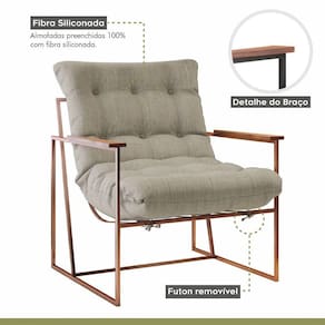 Poltrona M03 Estrutura Em Ferro Mais Decor Cobre/areia Dona de uma tonalidade classica e design que se destaca em qualquer ambiente, a Poltrona M03 vai oferecer o empurraozinho que seu lar-style precisa para ficar impecavel. Com estrutura moderna, o cantinho em que escolher posiciona-la - seja sala de estar, dormitorio ou home office - ficara aconchegante e os momentos relax serao muito mais completos e prazerosos. De quebra, a decoracao vai ganhar uma aliada de muito charme e que sera essencial para deixar o dia a dia ai na sua casa mais bonito e sofisticado. Caracteristicas: Marca: Mais Decor Modelo: M03 Tecido Predominante: Linho Material da Estrutura: Ferro Tipo de Poltrona: Decorativa Acompanha Puff: Nao Tipo de Encosto: Fixo Almofada do Encosto: Fixa Enchimento do Encosto: Espuma D-18 Altura do Encosto: 50 cm Tipo de Espuma do Encosto: Fibra Siliconada Tipo de Assento: Fixo Altura do Assento ate o Chao: 45 cm Enchimento do Assento: Espuma D-26 Firmeza do Assento: Medio Tipo de Espuma do Assento: Espuma Convencional Material do Braco: Madeira Possui Apoio para Bracos: Sim Enchimento do Braco: Nao Possui Possui Pes: 04 Material dos Pes: Ferro Altura dos Pes: 31 cm Necessita Montagem: Nao Recomendacoes de Uso, Manutencao e Limpeza: Uma boa maneira de aumentar o tempo de vida util do seu sofa e evitar exposicao direta do estofado ao sol, ja que os raios podem queimar e manchar a grande maioria dos tecidos desses itens da sua casa. Suporta Ate (kg): 120 Possui Percintas Elasticas: Sim