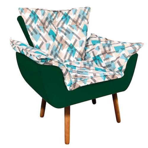 Poltrona Opala Composê Suede Verde com Estampado Traçado Azul D33 Pés Palito Castanho D?Rossi