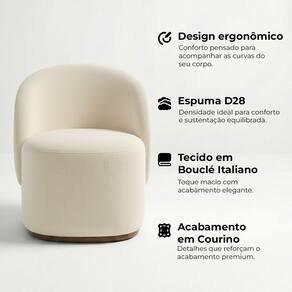 Madeira seca em estufa, espuma D28 (assento) e D20 (encosto/laterais), base fixa com pés em ABS, acabamento inferior em courino marrom, revestimento em bouclê italiano.Vendido e entregue por CONFFORT CASA