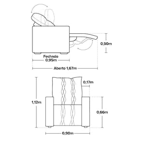 Especificação Técnica: -Material da Estrutura: Madeira de Reflorestamento; -Fixação da Estrutura: Grampos Galvanizados; -Material do Enchimento do Encosto: Fibra Siliconada, EspumaD23 e Percinta Elástica -Material do Enchimento do Assento: Espuma D28 Macia; -Material de Sustentação do Assento: Percinta Elástica e Molas Ensacadas; -Material do Revestimento: Tecido Veludo; -Almofadas dos Assentos: Fixas; -Almofadas do Encosto: Fixas; -Tipo de Encosto: Reclinável; -Tipo de Conforto: Hiper Macio; -Peso Suportado: 120 kg Por Pessoa; -Quantidade de Lugares: 1 Lugar; -Garantia: 3 Meses; -Necessita de Montagem? Sim; -Dimensões do Produto (LarguraXProfundidadeXAltura): 98x95x112cm; -Conteúdo da Embalagem: 1 Poltrona.