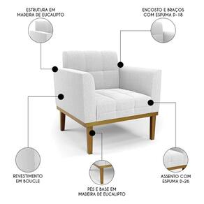 Esta Poltrona Para Sala é revestida em bouclé, que é confortável, suave ao toque, e ainda valoriza o design da poltrona. Os braços e encosto são confortáveis em espuma D-18, já o assento é com espuma D-26 de alta densidade, que garante um assento firme e aconchegante, ideal para relaxar após um dia cansativo. A base em madeira de eucalipto é um charme à parte, que confere um toque Rústico e sofisticado à peça. A poltrona tem uma estrutura resistente e suporta até 120 kg. A montagem é muito simples, pois a Poltrona já vem pronta, bastando apenas fixar a base com os parafusos que acompanham o produto. A limpeza também é muito prática, pois basta utilizar um pano limpo e levemente úmido, sem produtos abrasivos, para manter a sua poltrona sempre em bom estado. Sem dúvidas um item que vai transformar a sua sala em um ambiente mais confortável e estiloso!