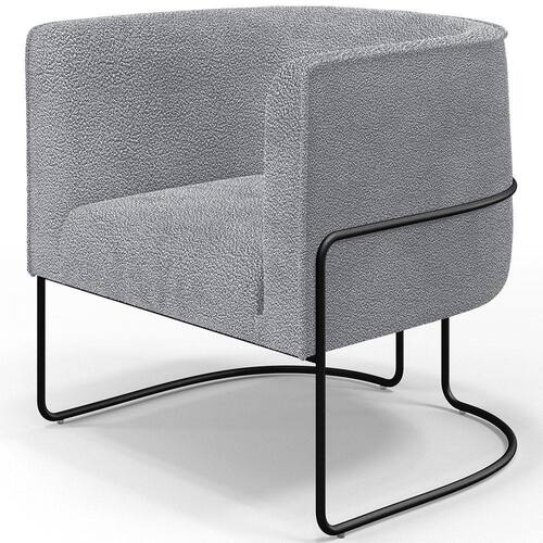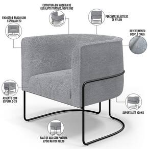 A Poltrona Decorativa Fixa Base Aço Preto Betina D02 Bouclê Cinza - Lyam Decor exala formosura e elegância! Excelente opção para dispor em sua sala de estar ou espera, recepção, hall de entrada, dormitório, qualquer área de circulação ou antessala entre um cômodo e outro, as possibilidades de combinação são infinitas. Seu protagonismo é notório, sem sombra de dúvidas é perfeita para qualquer ambientação que desejar colocá-la.