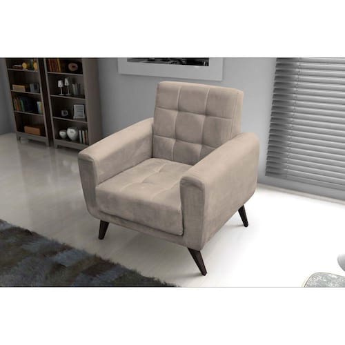 Poltrona com design contemporâeno sofisticado, para compor ambientes com muito aconchego e estilo. O toque do revestimento proporciona uma experiência de conforto incrível, você não vai querer sair da sua sala com essa peça! Acompanha Almofadas extras: Não Acompanha Puff: Não Almofada do assento: Fixa Almofada do encosto: Fixa Altura do assento até o chão: 45 Altura do Encosto: 88 Altura dos Pés: Ambiente Principal: Sala de Estar Complexidade da Montagem: Cor: Bege Cor do Produto: Bege Design Assinado: Não Enchimento do Assento: Espuma D-28 Enchimento do Braço: Espuma D-20 Enchimento do Encosto: Espuma D-20 Encosto para a Cabeça: Não Estampado: Não Extensível: Não Firmeza do Assento: Macio Informações Complementares: Itens Inclusos: 1 Poltrona Linha ou Coleção: Manual de Especificação Técnica: Manual de Montagem e Instalação: Material do Braço: Suede Material dos Pés: Madeira Modelo de Poltrona: Fixo Necessita Montagem: Não Origem do Produto: Nacional Peso: 15 Possui Percintas Elásticas: Sim Possui Pés: 04 Possui Rodízio: Não Profundidade quando extendido: Recomendações de Uso, Manutenção e Limpeza: Para maior durabilidade, recomendamos que a limpeza dos estofados com revestimento em tecido, seja feito com aspirador de pó em baixa rotação ou escova com cerdas macias para a eliminação de poeira. Não utilizar produtos de limpeza. Resistente à Chuva: Rodízio com Trava: Sistema de Montagem: Suporta Até (kg): 100 Tamanho: Tecido Predominante: Veludo Tipo de Assento: Fixo Tipo de Encosto: Fixo Tipo de Espuma do Assento: Espuma Convencional Tipo de Espuma do Encosto: Espuma Convencional Tipo de Poltrona: Decorativa