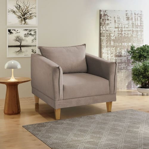 Chegou a sua nova companheira para relaxar com estilo: nossa Poltrona Decorativa! Com design moderno, tecido superconfortável e Pillow dos assentos com 10 cm de altura, ela é perfeita para aquele cantinho preferido que você se joga depois de um dia corrido. Feita com materiais de alta qualidade e pés de madeira, essa peça vai trazer aquele toque de sofisticação e conforto que você estava procurando. Ideal para qualquer ambiente, seja no escritório, na sala de estar ou uma poltrona para o quarto, ela vai ser a estrela da sua casa. Aproveite e transforme seu espaço com praticidade e bom gosto! Acompanha Almofadas extras: Não Acompanha Puff: Não Almofada do assento: Fixa Almofada do encosto: Removível Altura do assento até o chão: 45 cm Altura do Encosto: 46 cm Altura dos Pés: 14 cm Ambiente Principal: Sala de Estar Cor: Bege Cor do Produto: Bege Design Assinado: Não Enchimento do Assento: Espuma D-28 Enchimento do Braço: Espuma D-28 Encosto para a Cabeça: Não Estampado: Não Extensível: Não Firmeza do Assento: Macio Informações Complementares: Assento Pillow com 10 cm de altura Itens Inclusos: 1 Poltrona Linha ou Coleção: Melina Material do Braço: Espuma e Madeira Material dos Pés: Madeira de Eucalipto Modelo de Poltrona: Fixo Necessita Montagem: Não Origem do Produto: Nacional Peso: 35 kg Possui Percintas Elásticas: Sim Possui Pés: 04 Possui Rodízio: Não Recomendações de Uso, Manutenção e Limpeza: Não utilizar produtos químicos. Não utilizar produtos abrasivos. Não molhar. Utilizar pano macio e seco . Suporta Até (kg): 120 kg Tecido Predominante: Veludo Tipo de Assento: Fixo Tipo de Encosto: Fixo Tipo de Espuma do Assento: Soft Tipo de Poltrona: Decorativa Marca: Celflex