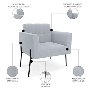 A Poltrona Para Sala é revestida em bouclé, que é confortável, suave ao toque, e ainda valoriza o design da poltrona. Os braços e encosto são confortáveis em espuma D-18, já o assento é com espuma D-26 de alta densidade, que garante um assento firme e aconchegante, ideal para relaxar após um dia cansativo. Os Pés de Ferro, não só garantem estabilidade e longevidade, mas também adicionam um toque de luxo ao design geral. São 2 poltronas com estrutura resistente que suporta até 120 kg cada. A montagem é muito simples, pois a poltrona já vem pronta, bastando apenas fixar a base com os parafusos que acompanham o produto. A limpeza também é muito prática, pois basta utilizar um pano limpo e levemente úmido, sem produtos abrasivos, para manter a sua poltrona sempre em bom estado. Sem dúvidas a Poltrona Para Sala vai transformar seu ambiente, deixando mais confortável e estiloso!