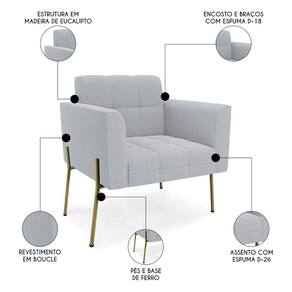 Se você quer uma poltrona que combine com a sua Sala De Estar, recepção ou seu quarto, que ofereça conforto e qualidade? Então você vai adorar a Poltrona Para Sala Pés Metálicos Dourado Ana Bouclé Cinza, da Ibiza!