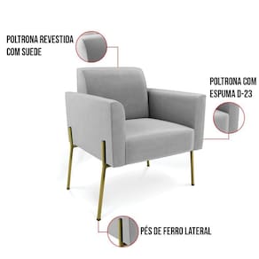 Todo mundo gosta de um ambiente bem decorado, e se for novidade melhor ainda não é mesmo? A D'Rossi, além de entregar beleza, qualidade e confiança aos clientes, ela dispõe das melhores opções em produtos, disponíveis no mercado! Portanto, se você quer um produto sofisticado, opte pela Poltrona Marisa. Ela possui um design lindo e sofisticado, com pés de Ferro Lateral Dourado e revestimento em tecido Suede Cinza, que harmonizam com qualquer ambiente. Esta mobília fica perfeita na sala de estar, recepções, mesa de jantar ou qualquer outro espaço que você queira decorar com estilo e bom gosto. Ela contém uma estrutura em madeira de reflorestamento eucalipto, que garante a resistência e a sustentabilidade do produto. Ela suporta até 120 kg de peso, podendo ser utilizada por pessoas de diferentes biotipos. Ela tem um acabamento reforçado e espuma de qualidade D-23, garantindo flexibilidade e conforto ao usuário. A Poltrona Marisa é um produto de alta qualidade, beleza e funcionalidade. Ela é fácil de transportar, pois tem um peso leve e um tamanho compacto. A Poltrona Marisa é ideal, para dar aquele realce que seu ambiente precisa. Tenho certeza que esse móvel é a melhor compra que você irá fazer. Garanta já sua Poltrona Marisa e se acomode da melhor maneira possível!Dimensões da Poltrona: Altura total: 81 cm Largura total: 76 cm Profundidade total: 64 cm Altura do encosto: 36 cm Largura do assento: 47 cm Profundidade do assento: 48 cm Altura do chão ao assento: 45 cm Espessura do assento: 18 cm Tamanho dos pés: 30 cm Espessura do braço: 9 cm Peso: 14 kg Especificações do Produto Estrutura: Madeira Eucalipto Espuma: D-23 Tecido: Suede Tipo de pés: Pés de Ferro Dourado Peso suportado: Até 120 Kg Garantia: 90 dias contra defeito de fabricação Montagem: O produto vai montado, apenas parafusar a base Instruções de limpeza: Utilizar um pano limpo e levemente úmido Você irá receber: Poltronas - Entregue em: 01 Volumes