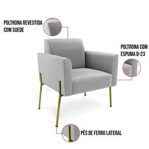 Todo mundo gosta de um ambiente bem decorado, e se for novidade melhor ainda não é mesmo? A D'Rossi, além de entregar beleza, qualidade e confiança aos clientes, ela dispõe das melhores opções em produtos, disponíveis no mercado! Portanto, se você quer um produto sofisticado, opte pela Poltrona Marisa. Ela possui um design lindo e sofisticado, com pés de Ferro Lateral Dourado e revestimento em tecido Suede, que harmonizam com qualquer ambiente. Esta mobília fica perfeita na sala de estar, recepções, mesa de jantar ou qualquer outro espaço que você queira decorar com estilo e bom gosto. Ela contém uma estrutura em madeira de reflorestamento eucalipto, que garante a resistência e a sustentabilidade do produto. Ela suporta até 120 kg de peso, podendo ser utilizada por pessoas de diferentes biotipos. Ela tem um acabamento reforçado e espuma de qualidade D-23, garantindo flexibilidade e conforto ao usuário. A Poltrona Marisa é um produto de alta qualidade, beleza e funcionalidade. Ela é fácil de transportar, pois tem um peso leve e um tamanho compacto. A Poltrona Marisa é ideal, para dar aquele realce que seu ambiente precisa. Tenho certeza que esse móvel é a melhor compra que você irá fazer. Garanta já sua Poltrona Marisa e se acomode da melhor maneira possível!