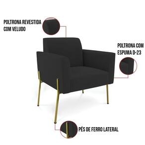 Todo mundo gosta de um ambiente bem decorado, e se for novidade melhor ainda não é mesmo? A D'Rossi, além de entregar beleza, qualidade e confiança aos clientes, ela dispõe das melhores opções em produtos, disponíveis no mercado! Portanto, se você quer um produto sofisticado, opte pela Poltrona Marisa. Ela possui um design lindo e sofisticado, com pés de Ferro Lateral Dourado e revestimento em tecido Veludo, que harmonizam com qualquer ambiente. Esta mobília fica perfeita na sala de estar, recepções, mesa de jantar ou qualquer outro espaço que você queira decorar com estilo e bom gosto. Ela contém uma estrutura em madeira de reflorestamento eucalipto, que garante a resistência e a sustentabilidade do produto. Ela suporta até 120 kg de peso, podendo ser utilizada por pessoas de diferentes biotipos. Ela tem um acabamento reforçado e espuma de qualidade D-23, garantindo flexibilidade e conforto ao usuário. A Poltrona Marisa é um produto de alta qualidade, beleza e funcionalidade. Ela é fácil de transportar, pois tem um peso leve e um tamanho compacto. A Poltrona Marisa é ideal, para dar aquele realce que seu ambiente precisa. Tenho certeza que esse móvel é a melhor compra que você irá fazer. Garanta já sua Poltrona Marisa e se acomode da melhor maneira possível!